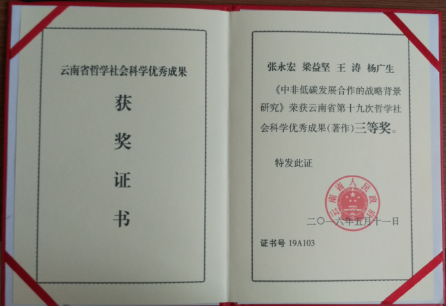 近日,云南省第十九次哲学社会科学优秀成果奖公布,云南大学非洲中心张永宏、梁益坚、王涛、杨广生的著作《中非低碳发展合作的战略背景研究》获得三等奖。