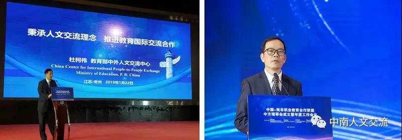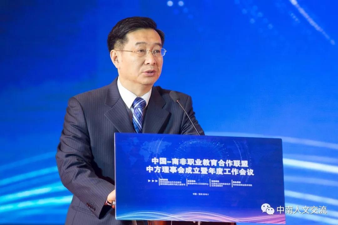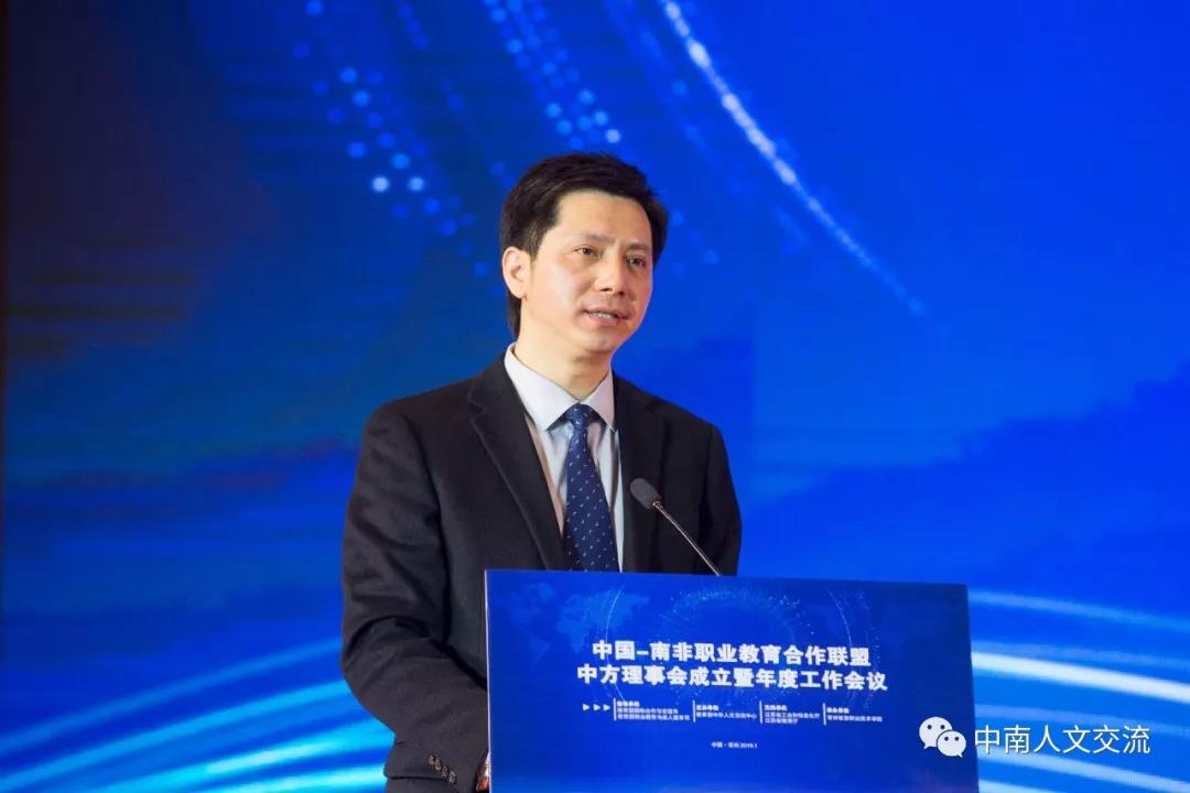 中南职教合作联盟网讯:2019年1月22日,中国—南非职业教育合作联盟中方理事会成立暨年度工作会议在常州召开。本次会议由教育部中外人文交流中心主办,常州信息职业技术学院承办。教育部中外人文交流中心主任杜柯伟、教育部国际合作与交流司亚非处处长李旭东、教育部职业教育与成人教育司调研员郁洁、江苏省工业和信息化厅副厅长池宇、常州信息职业技术学院党委书记王钧铭出席开幕式并致辞。会议开幕式由常州信息职业技术学院校长周勇、教育部中外人文交流中心副主任夏娟主持。国内高职院校、知名企业代表和教育对外开放、产教融合、南非及非洲问题研究专家等约180人参会。