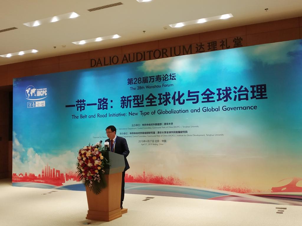4月27日,由中共中央对外联络部、清华大学联合主办,中共中央对外联络部研究室、清华大学全球共同发展研究院承办的第二十八届万寿论坛在苏世民书院达理礼堂举行。本届万寿论坛主题为“一带一路:新型全球化与全球治理”,这是在第二届“一带一路”国际合作高峰论坛召开后第一时间对国家主席习近平讲话进行的讨论宣讲。中联部副部长郭业洲、清华大学党委书记陈旭、意大利前总理达莱马、尼泊尔前总理尼帕尔、摩洛哥前参议长穆罕默德·比亚迪拉、阿根廷共和国方案党第一副主席马查多、埃塞俄比亚埃革阵总书记比纳弗、日本自民党国际部长小泉龙司等嘉宾,以及多国前政要、政党代表、大学校长、专家学者等百余位代表围绕论坛主题进行了深入交流。中联部研究室主任栾建章主持开幕式。
