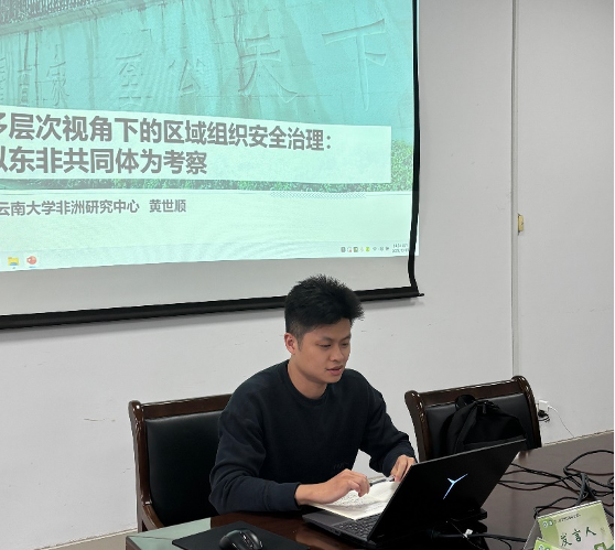 博士研究生黄世顺在分论坛“非洲区域一体化、国家治理与安全”上做了题为《多层次视角下的区域组织安全治理:以东非共同体为考察》的发言。他认为,只有将外部援助、内部合作与区域竞争的视角结合,才能全面理解东非共同体安全治理实践的内在逻辑。